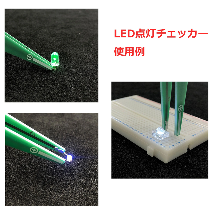 ピンセットでつまむように対象LEDを挟むことで、簡単に導通チェックや極性の確認ができます。