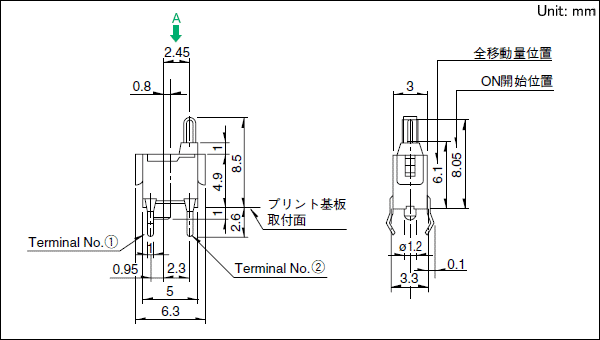 使用温度範囲:-40℃ ~ +85℃最大定格/最小定格(抵抗負荷):0.1A 30V DC/50μA 3V DC
