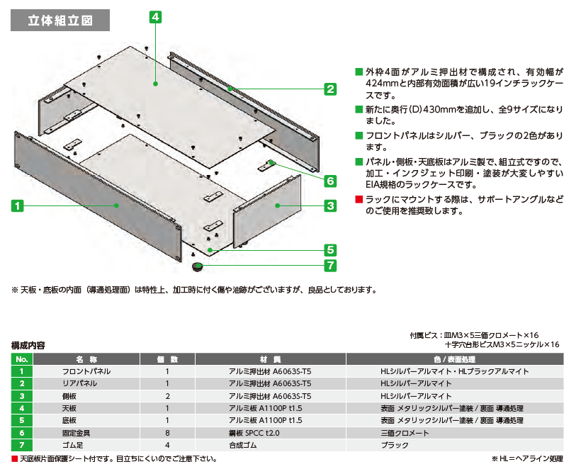 ■ パネル・側板・天底板はアルミ製で、組立式ですので、加工・インクジェット印刷・塗装が大変しやすいEIA規格のラックケースです。