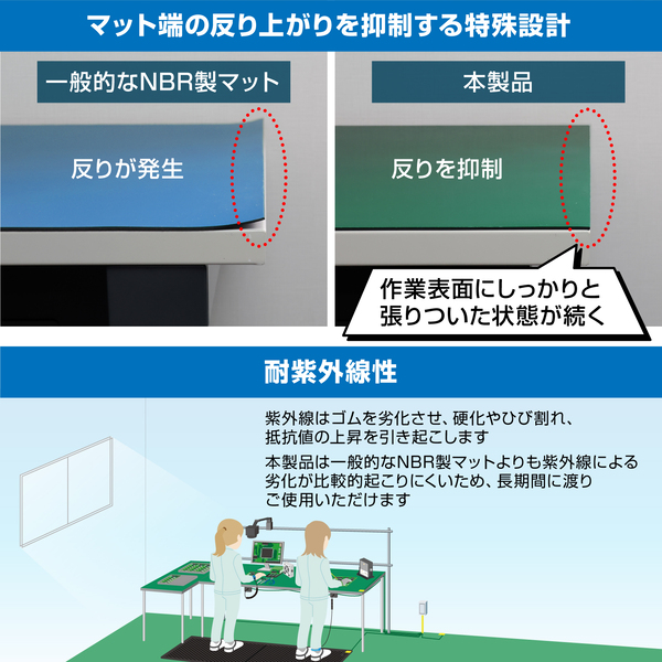 一般的なNBR製マットよりも紫外線による劣化が起こりにくいため、長期間に渡りご使用いただけます。※メーカー試験による