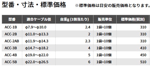 | 型番 | 適合ケーブル径 | 自重g(1個当たり) | 販売単位 | 標準価格(税別) |